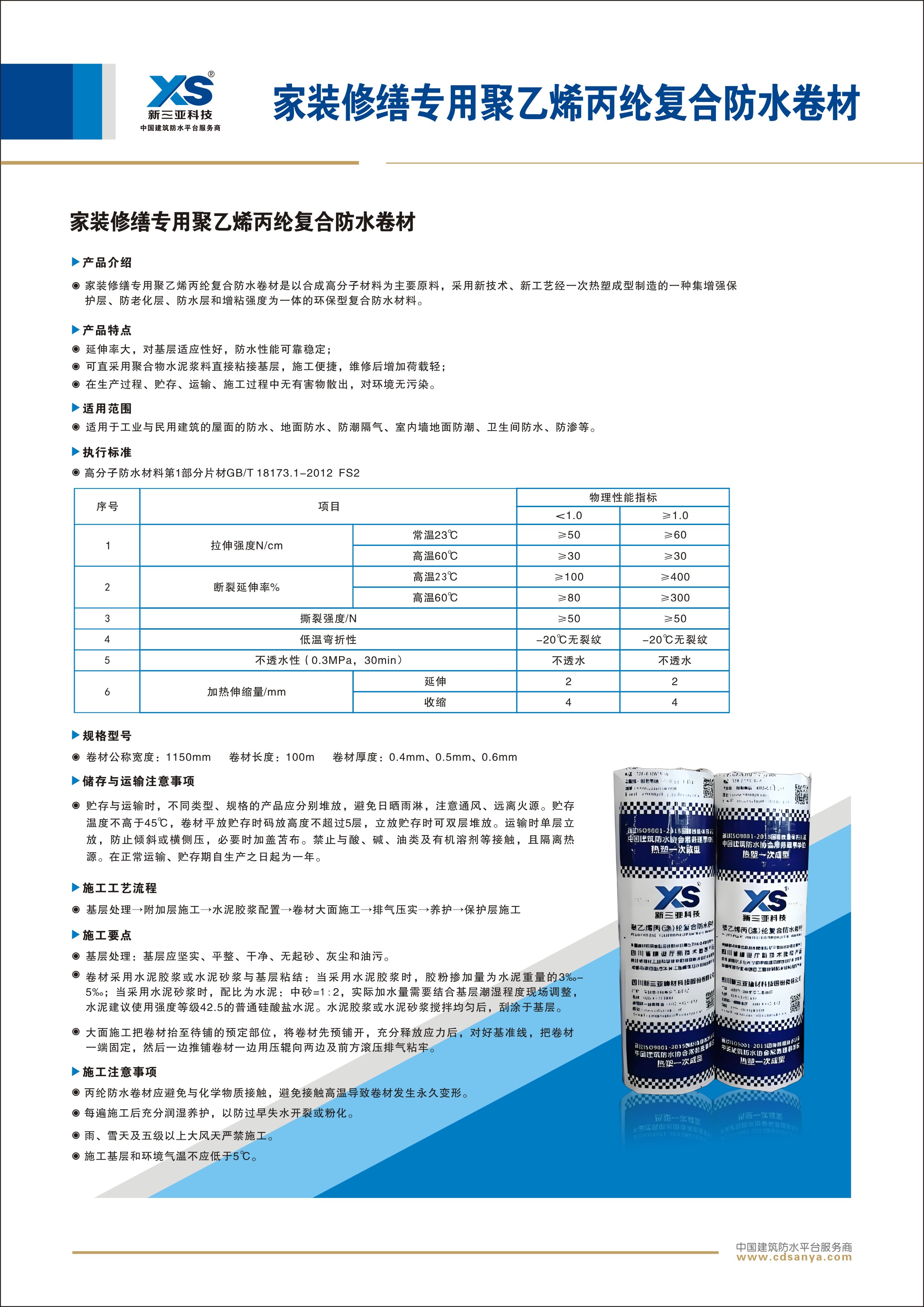產品簡介: 乙烯丙綸復合防水卷材是以合成高分子材料為主要原料,采用新技術、新工藝經一次熱塑成型制造的一種集增強保護層、防老化層、防水層和增粘強度為一體的環保型復合防水材料。 規格: FS2-PE-0.4mm 1.15m×100m | ![]() | ![]() |