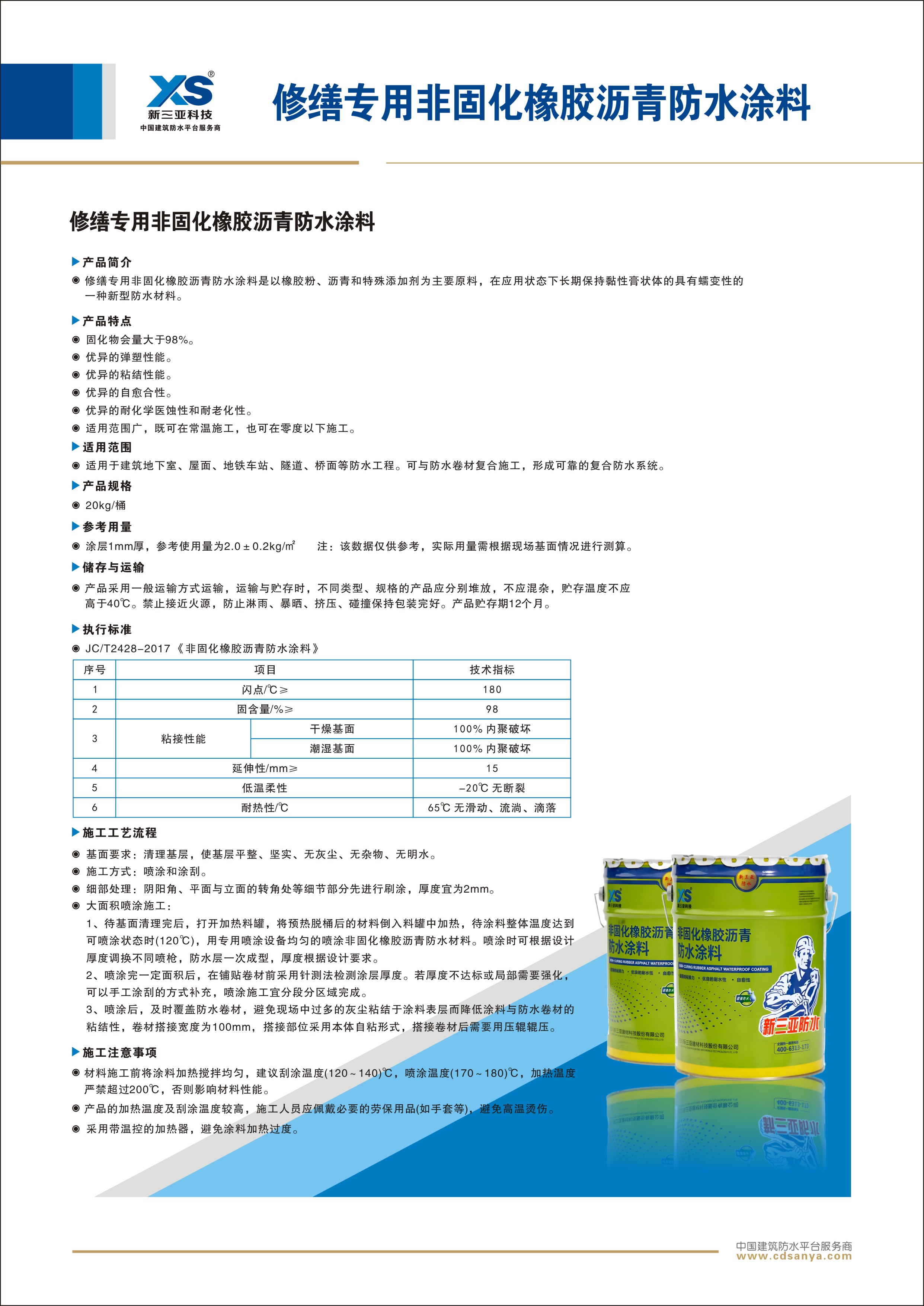 產品特點 1、 固化物會量大于98%; 2、優異的彈塑性能; 3、優異的粘結性能; 4、優異的自愈合性; 5、優異的耐化學醫蝕性和耐老化性; 6、適用范圍廣,既可在常溫施工,也可在零度以下施工 | ![]() |