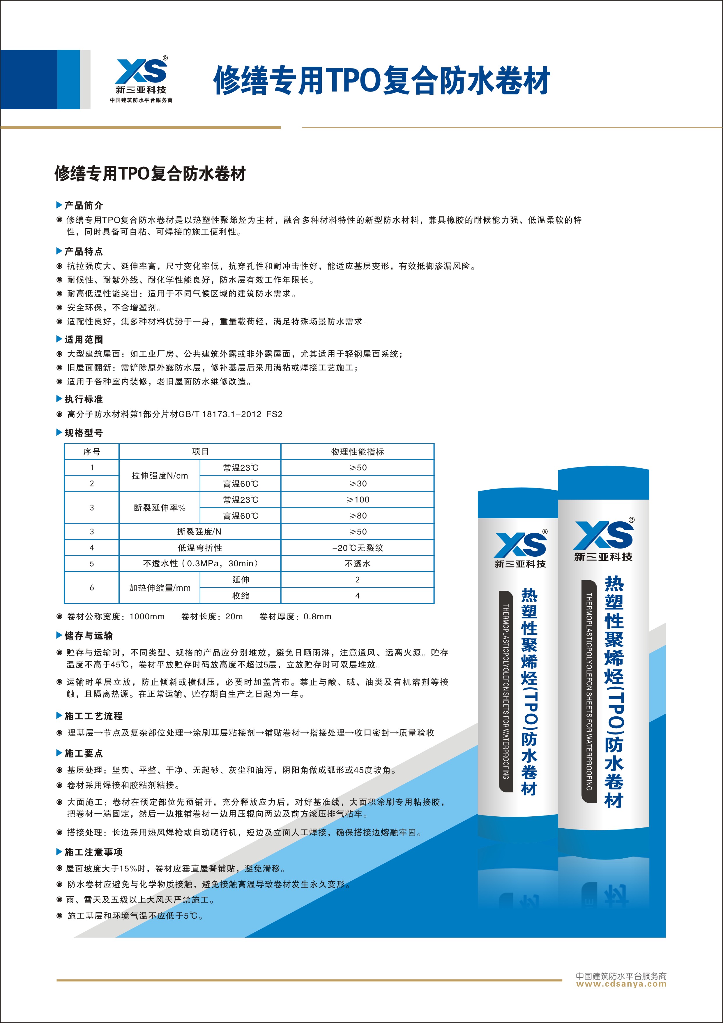 產品簡介: 修繕專用TPO復合防水卷材是以熱塑性聚烯烴為主材,融合多種材料特性的新型防水材料,兼具橡膠的耐候能力強、低溫柔軟的特性,同時具備可自粘、可焊接的施工便利性。 規(guī)格:FS2-TPO-20.0m×1.15m×0.8mm | ![]() |