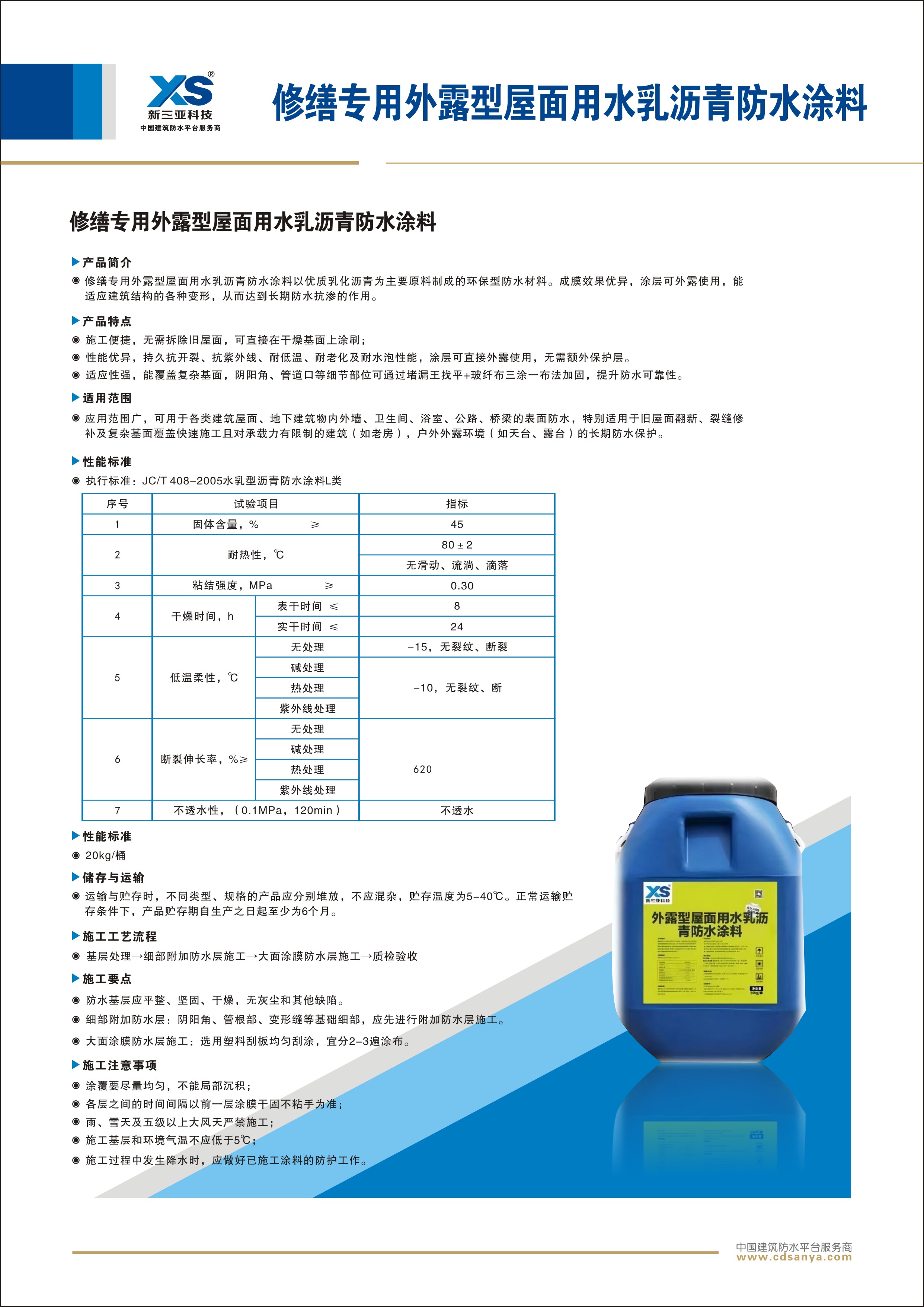產品簡介: 修繕專用外露屋面用水乳瀝青防水涂料是以優質乳化瀝青為主要原料制成的環保型防水材料。成膜效果優異,涂層可外露使用,能適應建筑結構的各種變形,從而達到長期防水抗滲的作用。 規格:18kg/桶 | ![]() |